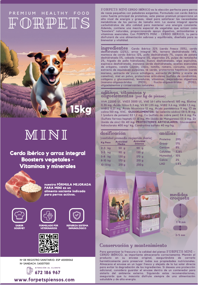 FORPETS MINI – CERDO IBÉRICO es la elección perfecta para perros de razas pequeñas con paladares exigentes. Formulado con cerdo ibérico como fuente principal de proteínas, este pienso premium proporciona un alto nivel de energía y grasas, ideal para satisfacer las necesidades metabólicas de los perros de tamaño mini. La avena integral aporta carbohidratos de alta calidad para mantener una energía constante. Además, contiene una mezcla especial de vegetales que actúan como «boosters» naturales, proporcionando apoyo digestivo, antioxidantes y vitaminas esenciales. Con FORPETS MINI – CERDO IBÉRICO, tu perro disfrutará de una alimentación sabrosa y equilibrada, diseñada para su bienestar y vitalidad.