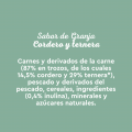 Carnes y derivados de la carne (87% en trozos, de los cuales 14,5% cordero y 29% ternera*), pescado y derivados del pescado, cereales, ingredientes (0,4% inulina), minerales y azúcares naturales.