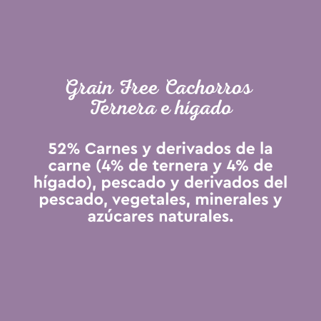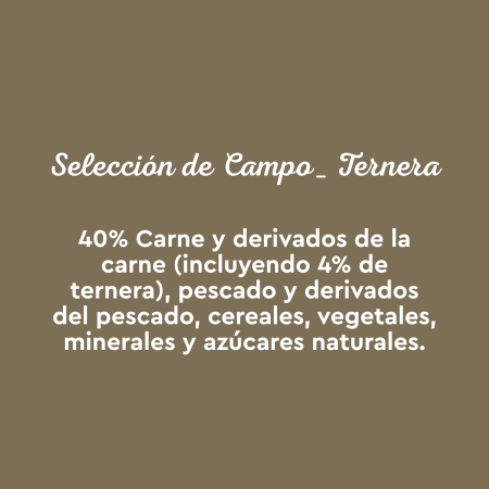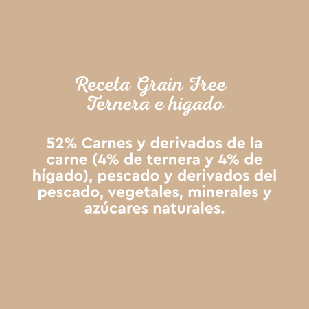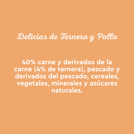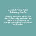 Carnes y derivados de la carne (60%), pescado y derivados del pescado (4% salmón y 4% trucha), vegetales (0,4% inulina) y minerales.